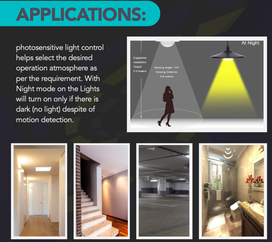 • Be ideal for wide range of Loads for example: ceiling light, cabinet light, street light, strip light, pendant light, filament light, night lamp, exhaust fan, regular fan, Security alarm speaker etc.